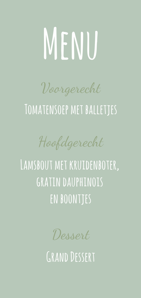 Trendy menukaart in mintgroen, een mooie combinatie met de witte en groene tekst! De achterkant van de kaart is wit, pas de teksten zelf eenvoudig aan in de online editor, een stijlvolle kaart voor het diner bij de communie van een jongen of meisje.