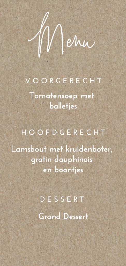 Eenvoudige menukaart van echt kraftpapier, de witte tekst komt daardoor mooi naar voren. Door gebruik van verschillende lettertypes maak je er een speels geheel van, kies zelf in de online editor, bon appétit!