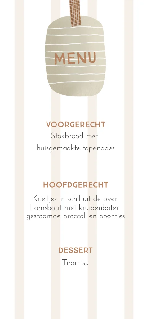 Bijpassende menukaart bij de communiekaart voor een jongen met beige strepen op witte achtergrond en een langwerpig ovaal tekstvak met tape.