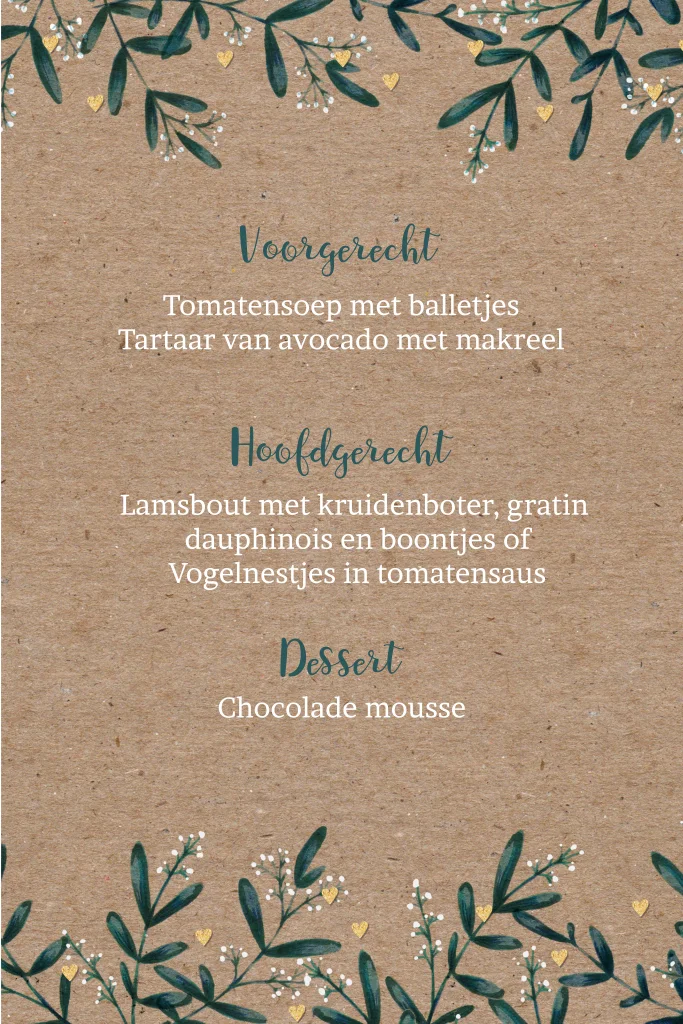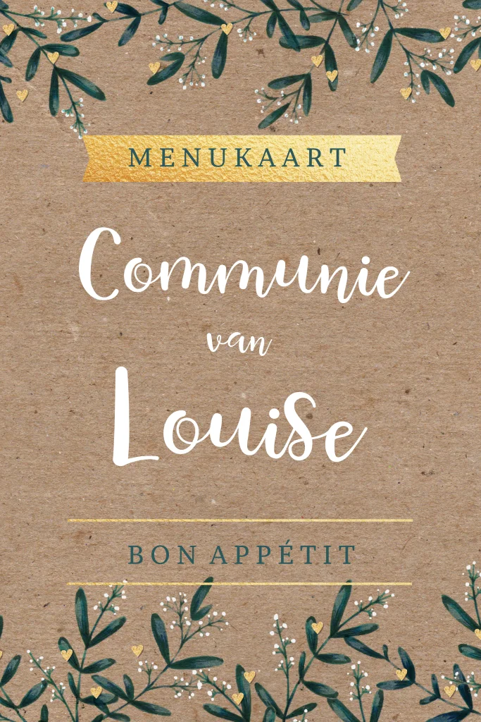 Hippe menukaart voor een communie op een mooie kraftlook achtergrond. Aan de randen van de kaart staan botanische groene takjes, witte bloemetjes en goudkleurige hartjes. Het moderne lettertype maakt de kaart helemaal trendy!