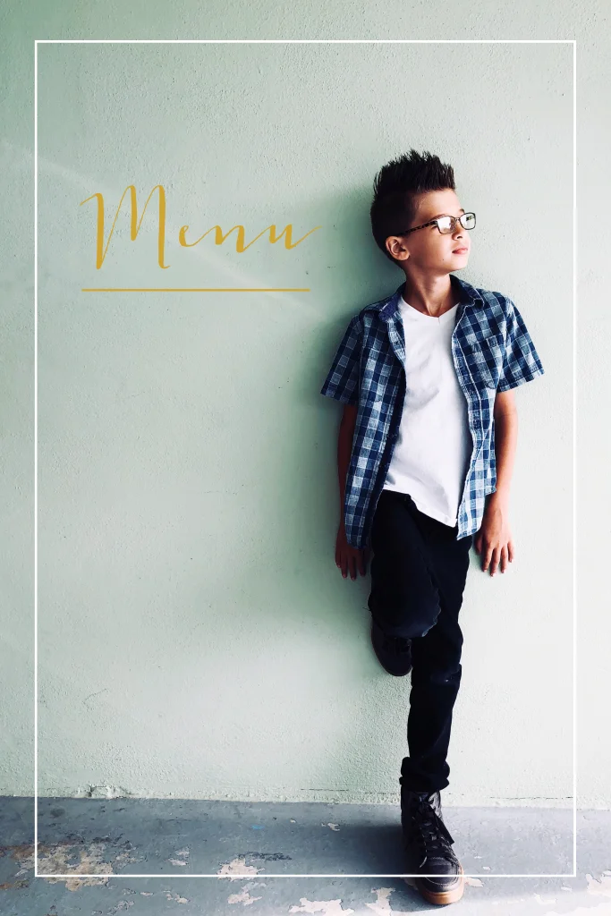 Menukaart voor een jongen met foto in subtiel kader en waterverf