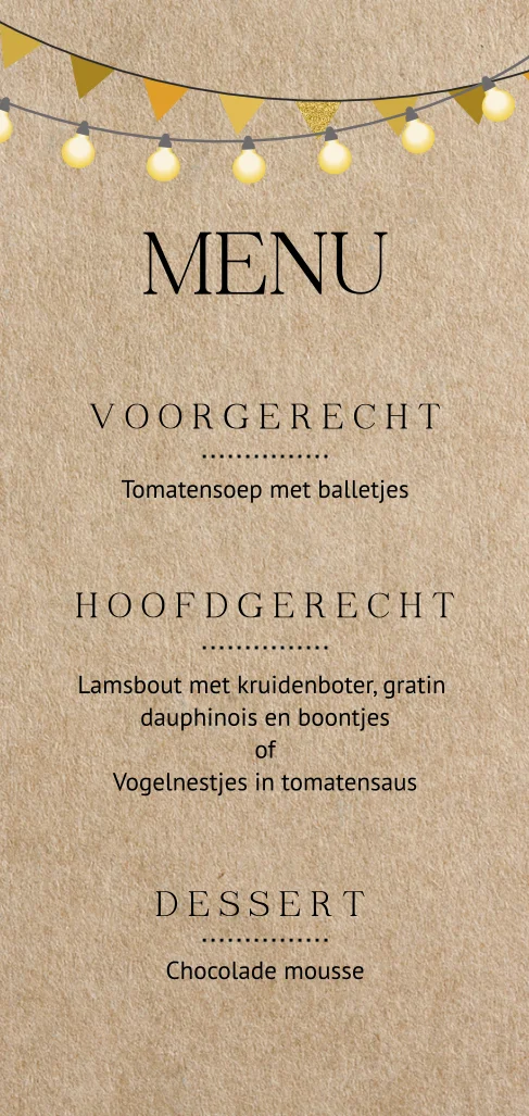 Super hippe menukaart met gezellige lampjes en goudkleurige vlaggetjes op een kraftlook achtergrond. De stijlvolle zwarte letters passen goed bij dit kaartje. Pas de tekst zelf aan in de online editor.