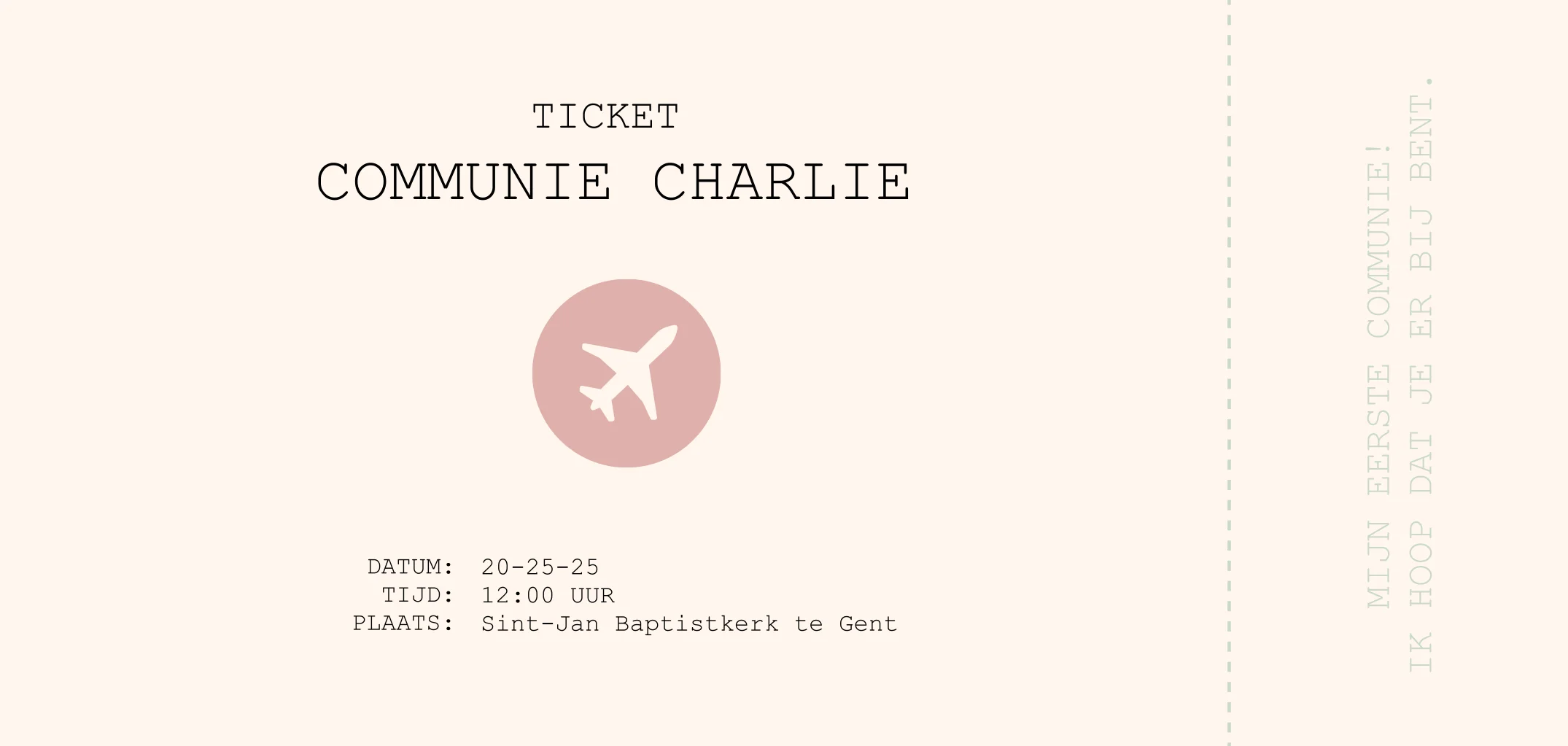 Deze langwerpige uitnodiging voor de communie is in de vorm van een vliegticket, echt origineel! Op de pastelkleurige achtergrond staat een symbool van een opstijgend vliegtuig in een roze cirkel. De tekst is in trendy moderne letters, deze pas je zelf eenvoudig aan in de online editor.