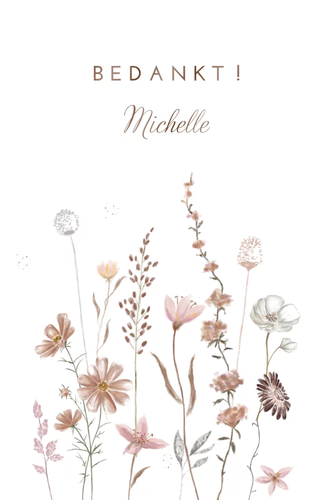 Een prachtig bedankkaartje voor de communie van een meisje. Op de voorzijde een aantal geschilderde veldbloemen in zachte tinten en op de achterkant van de kaart plaats je een eigen foto. Bedankt staat op de voorkant in hoogglans. Upload een leuke foto en maak de kaart persoonlijk in de online editor.