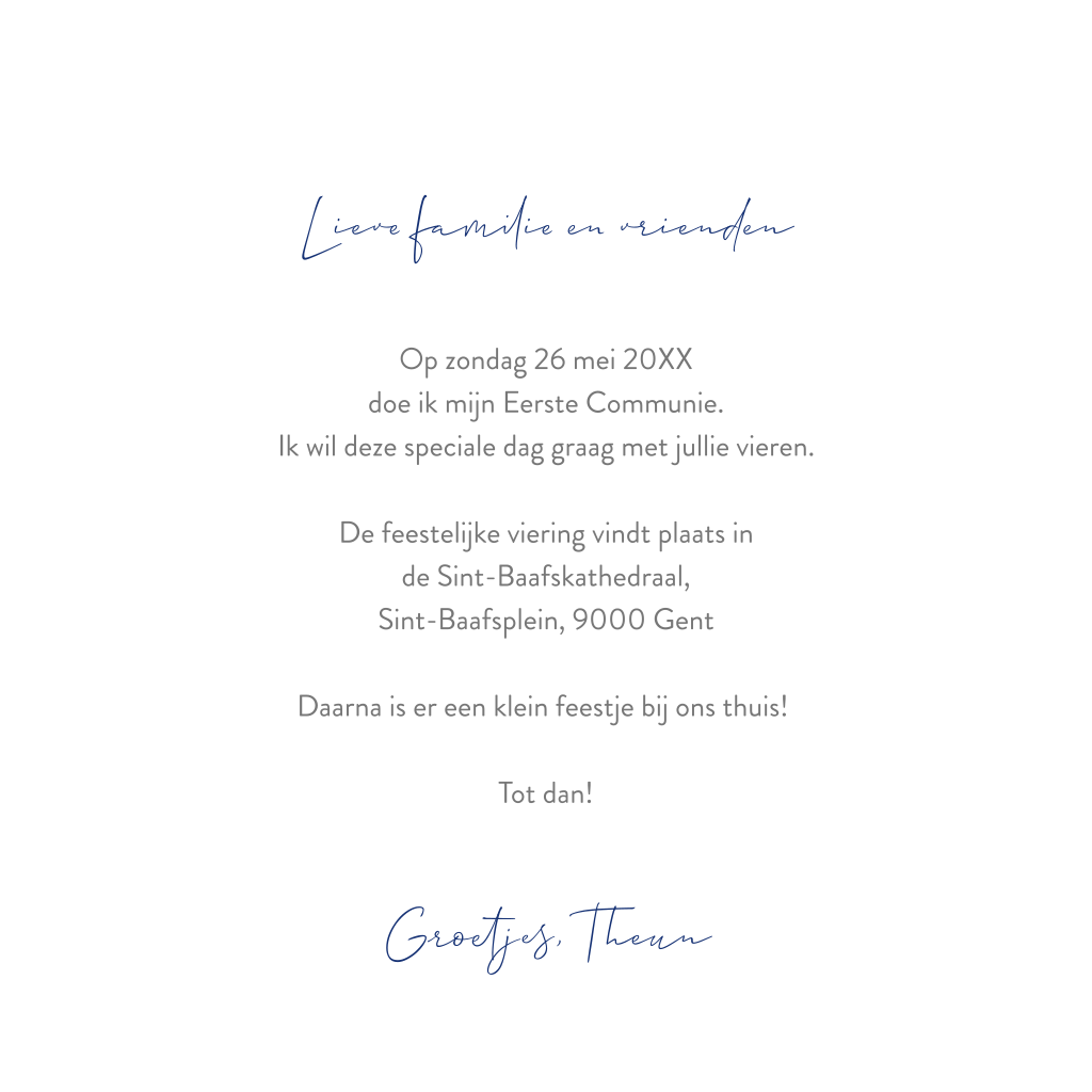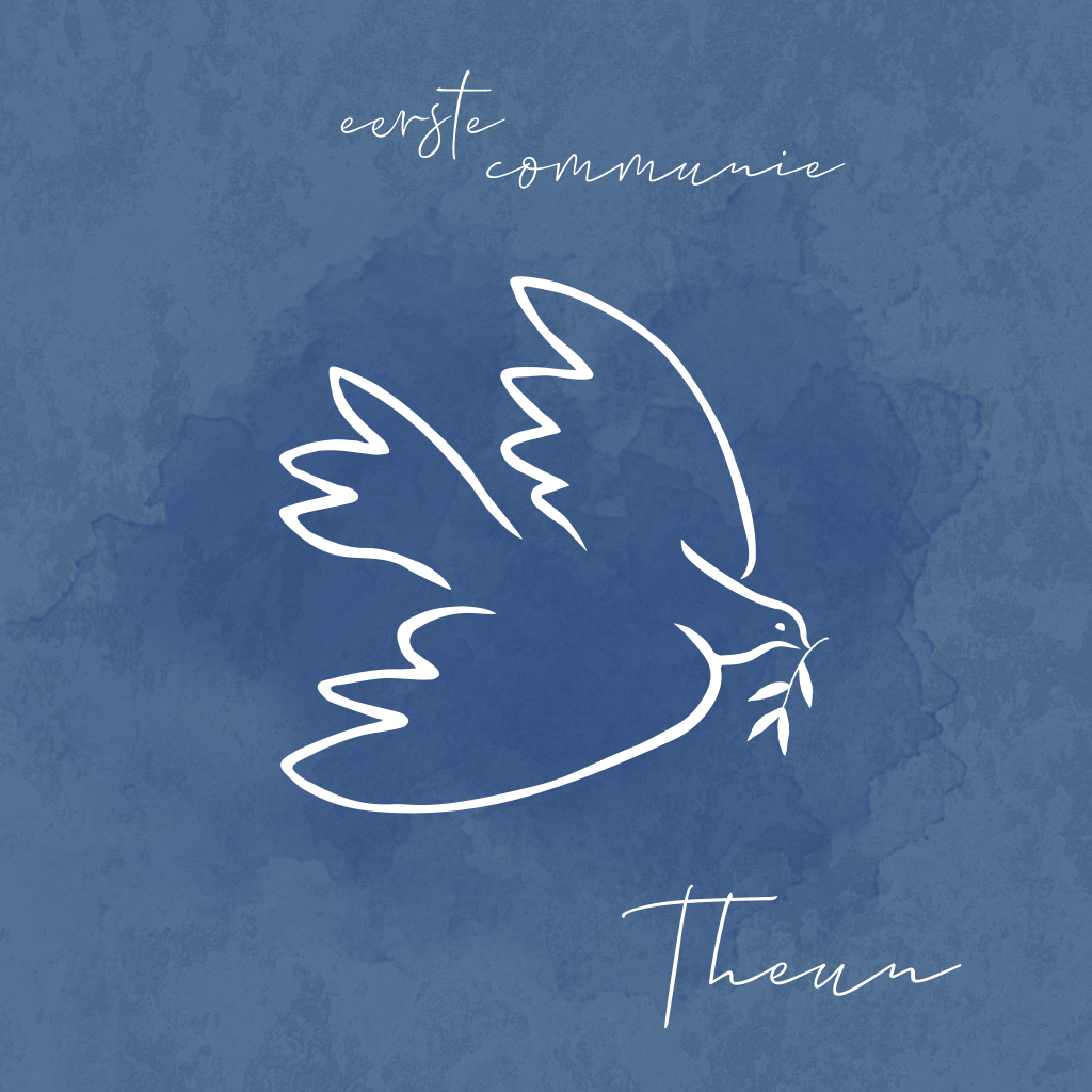 Deze prachtige communiekaart heeft een hemelsblauwe achtergrond, daardoor komt de tekening van de duif in goudfolie mooi naar voren! Aan de witte binnenzijde is ruimte om een eigen foto te uploaden en staat ook weer de tekening van de duif, maar dan in dezelfde kleur blauw als op de voorkant. Een trendy kaart met mooie lettertypes, natuurlijk kun je die naar wens aanpassen in de online editor.