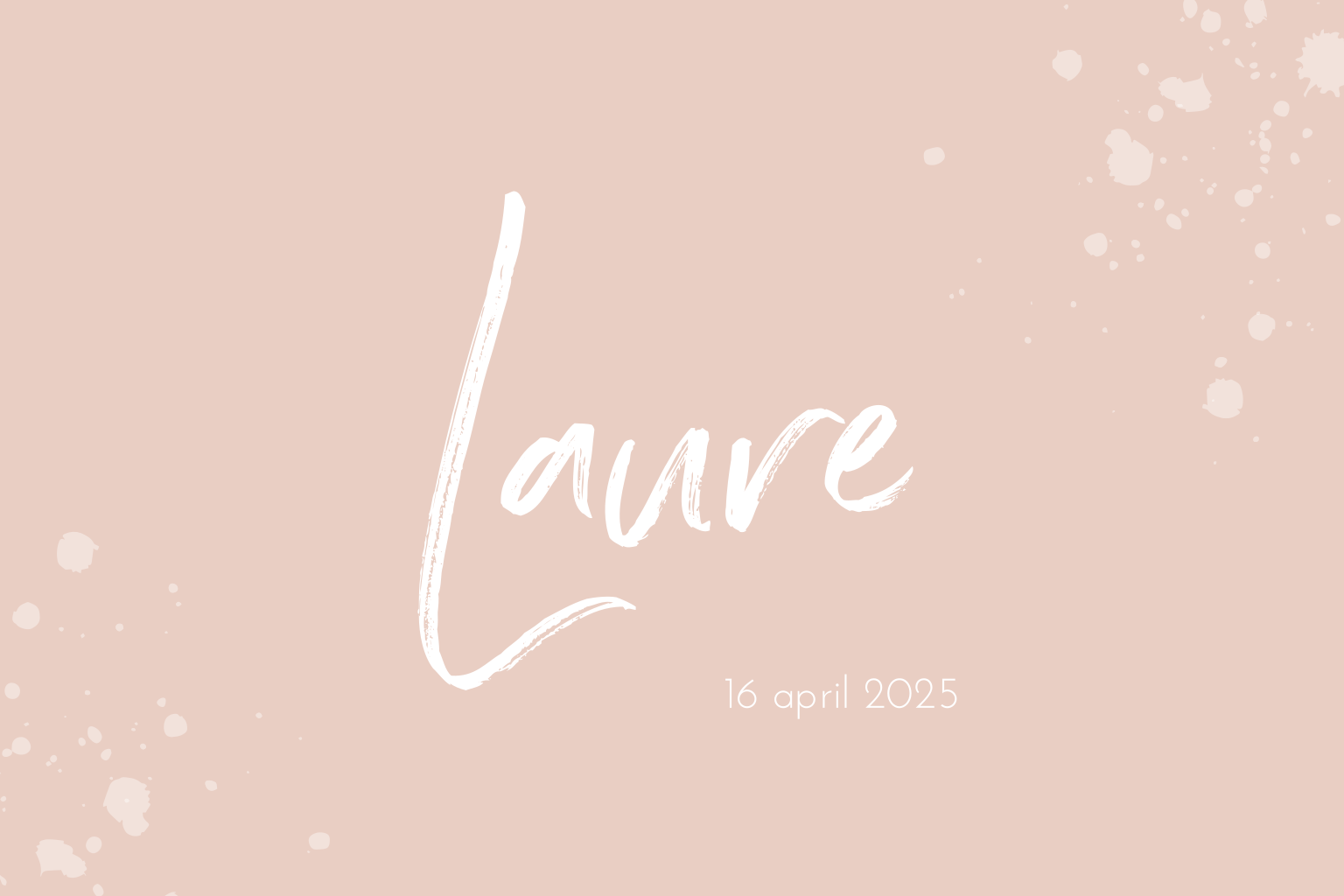 Mooie communiekaart met sierlijke letters op een lichtroze achtergrond. De verfspatten in de hoeken en aan de achterkant van de kaart en de mooie typografie maken de kaart helemaal hip!
