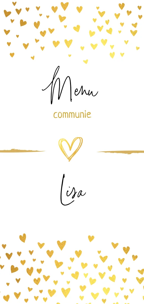 Mooie menukaart voor een communie met gouden hartjes
