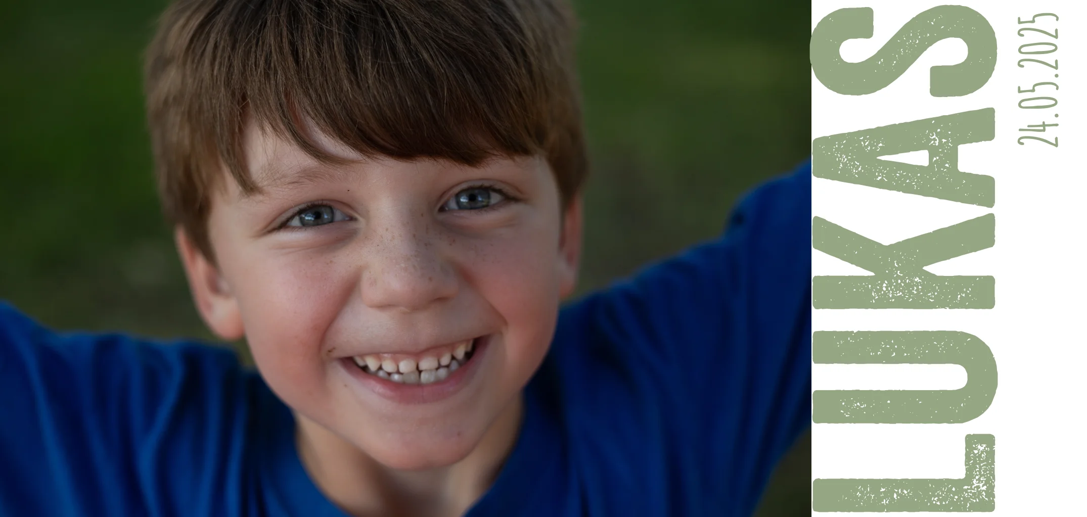 Stoere uitnodiging voor de communie van een jongen met de naam in trendy olijfgroene letters naast de foto. In de online editor voeg je eigen tekst en foto toe en maak je er een unieke kaart van!