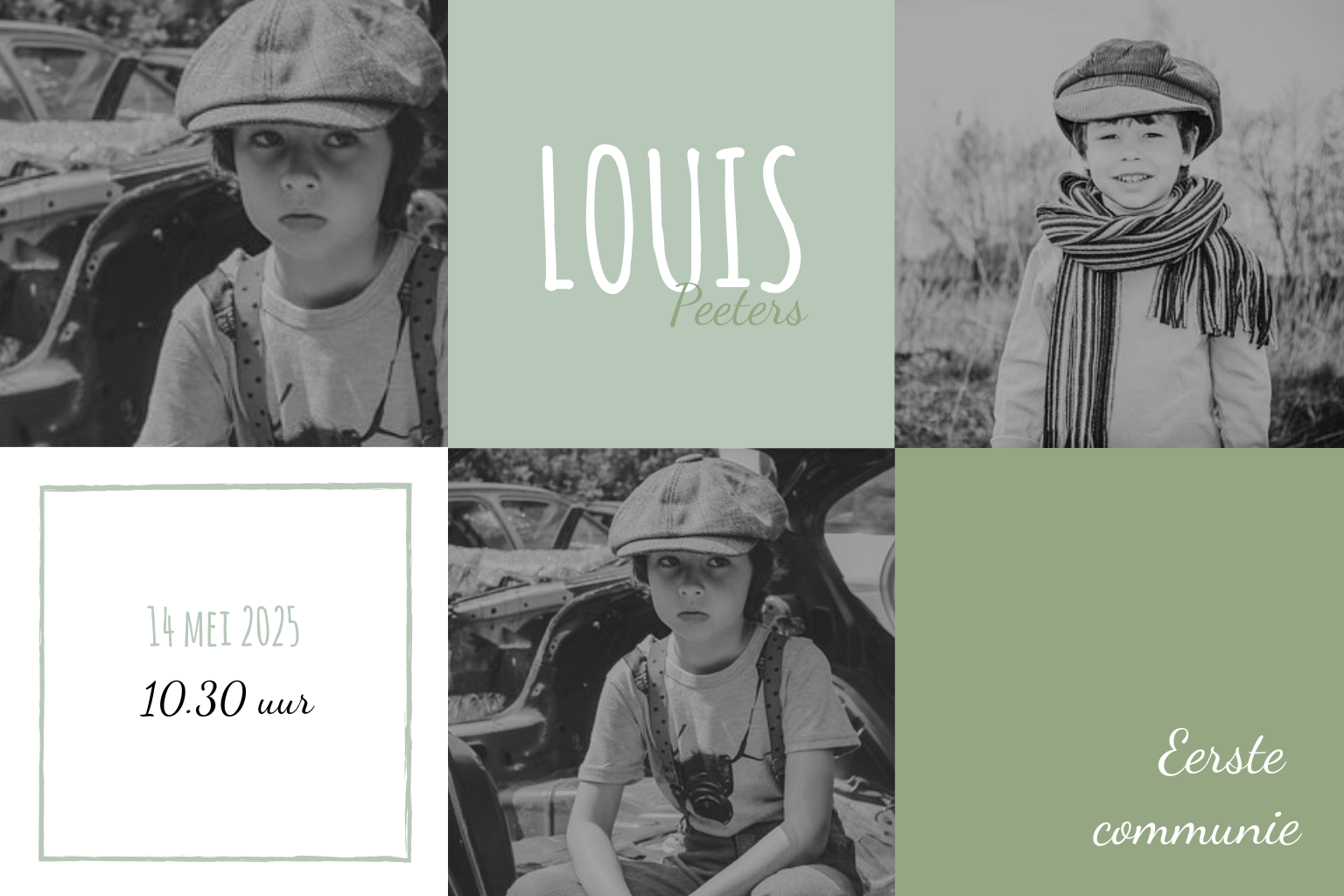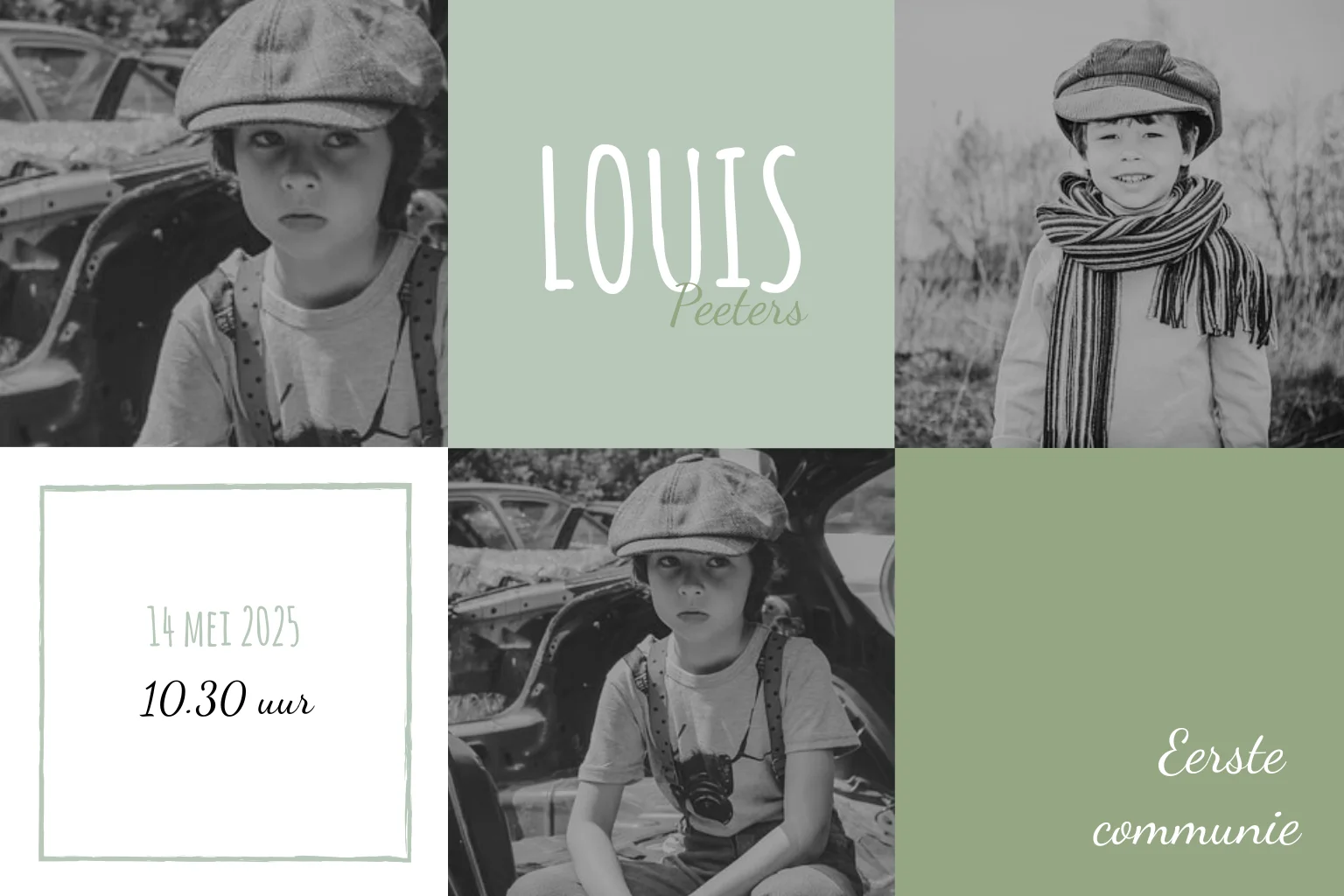Stoere communiekaart met foto en groene blokken