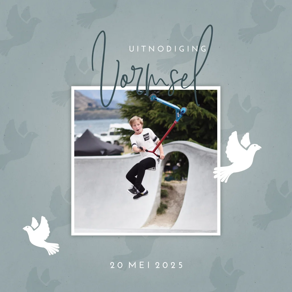 Ton sur ton vormsel uitnodiging met duiven op een blauwgrijze achtergrond. Deze jongensuitnodiging heeft afgeronde hoeken en ruimte voor een eigen foto. De foto en de tekst kunnen naar wens worden aangepast in de online editor.