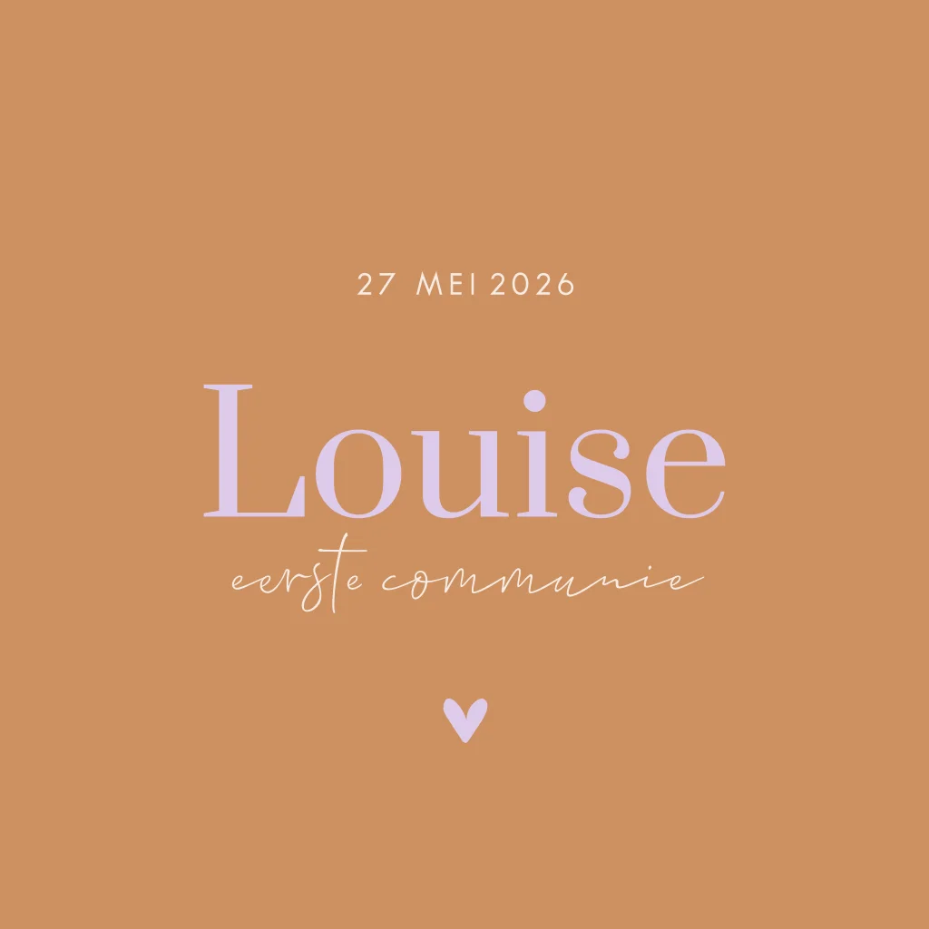 Hippe communiekaart in colourblok, oranje met lila tekst. Onder de tekst een leuk hartje, de achterkant van de kaart is in pasteltint met bijpassende kleuren tekst.