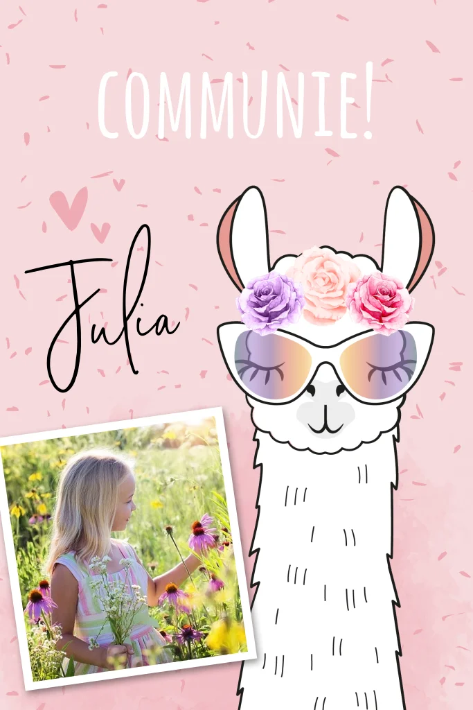 Hippe roze communiekaart met kleine hartjes voor een meisje. Kijk nou wat een grappige alpaca met een bloemenkrans en blitse bril op haar hoofd! In het witte kader op de voor- en achterkant kun je zelf foto's plaatsen van de kleine meid. Dit doe je in de online editor, daar voeg je ook eigen teksten toe.
