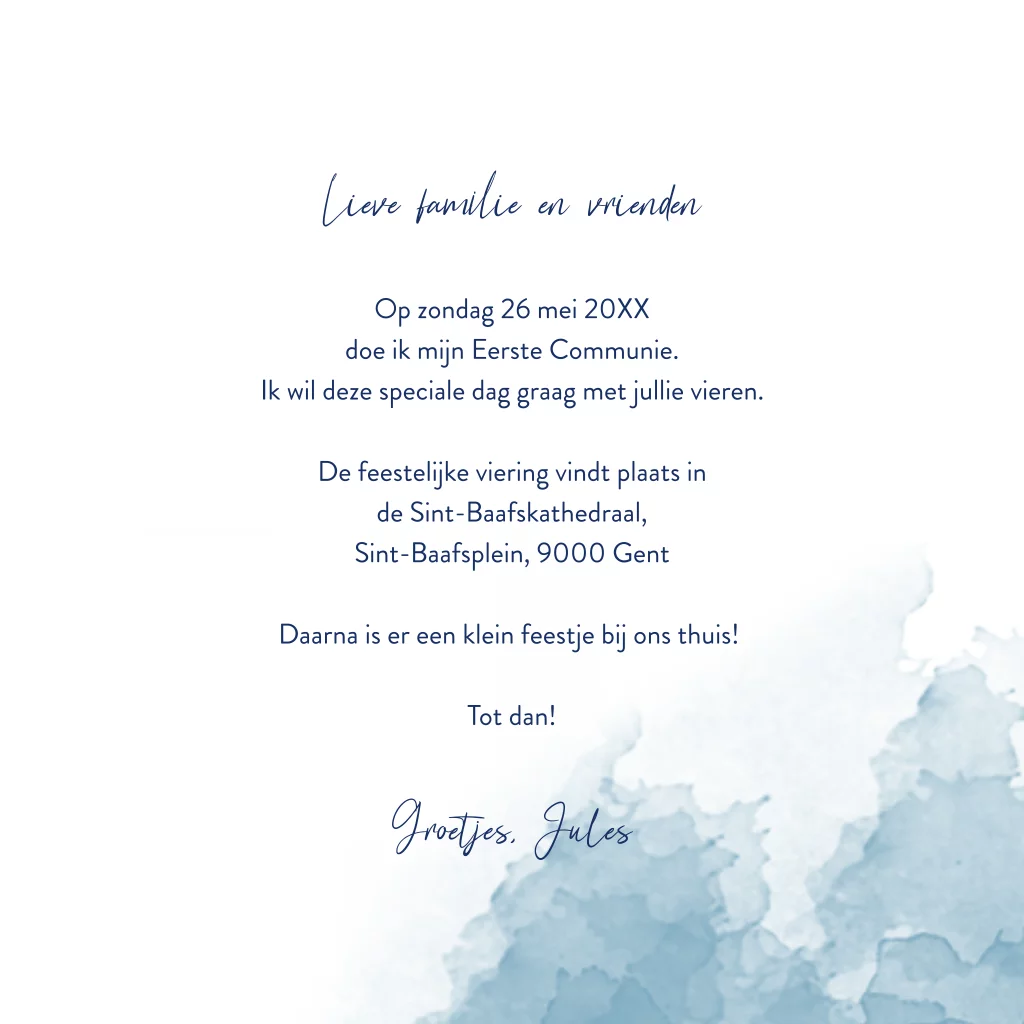 Op deze trendy communiekaart staat een getekende duif in goudfolie op een hemelsblauwe waterverf achtergrond. Aan de binnenzijde is ruimte voor een leuke foto en de tekst van de uitnodiging in hippe typografie, maak de kaart persoonlijk in de online editor, zo gedaan!