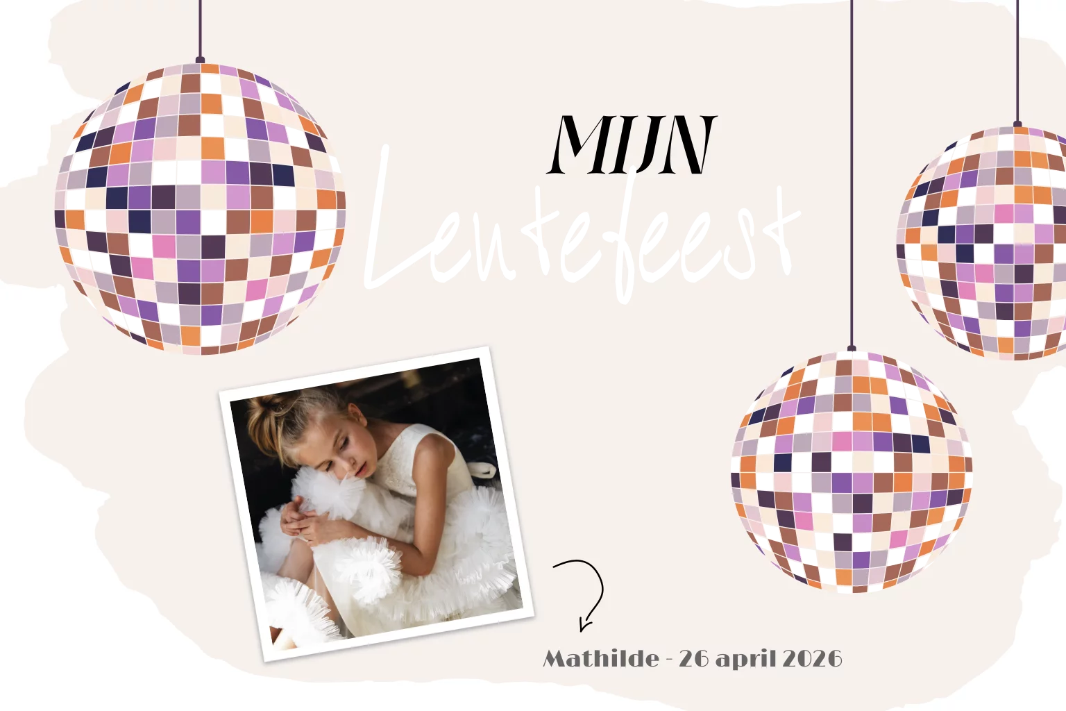 Trendy communiekaartje met foto, zilverfolie en discobal