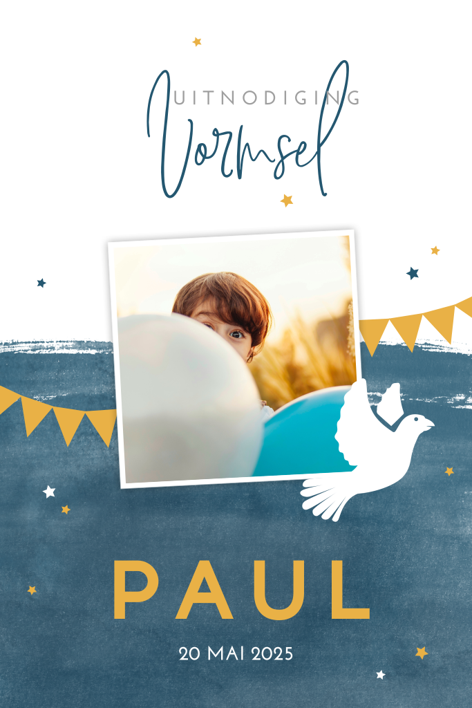 Moderne uitnodiging voor een vormsel met een vlak van blauwe waterverf onder de foto. De foto is in polaroid-stijl en in het kader het silhouet van een duif. De vlaggetjeslijn erachter geeft de kaart een feestelijke uitstraling. Met een hippe letter in bijpassende kleuren maak je deze kaart helemaal af! In de online editor kun je het ontwerp zelf aanpassen met eigen foto, kleur en lettertypes.