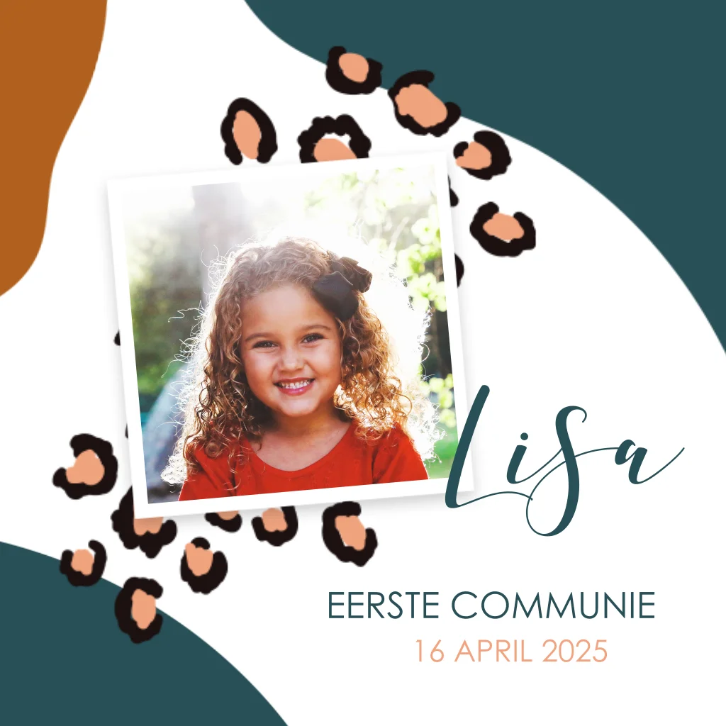Trendy uitnodiging communie met een panterprintje in roze en zwart en organische vormen in blauw en bruin op een witte achtergrond. Op de voorkant kun je een eigen foto downloaden in de online editor, hier pas je ook de teksten en lettertypes naar wens aan.