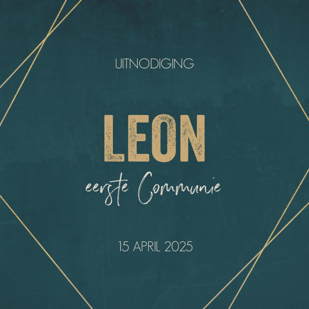 Trendy uitnodiging communie voor een jongen in donker petrol krijtbord-look. Langs de rand staan geometrische lijnen, de naam staat in stoere letters in bijpassende goudkleur.