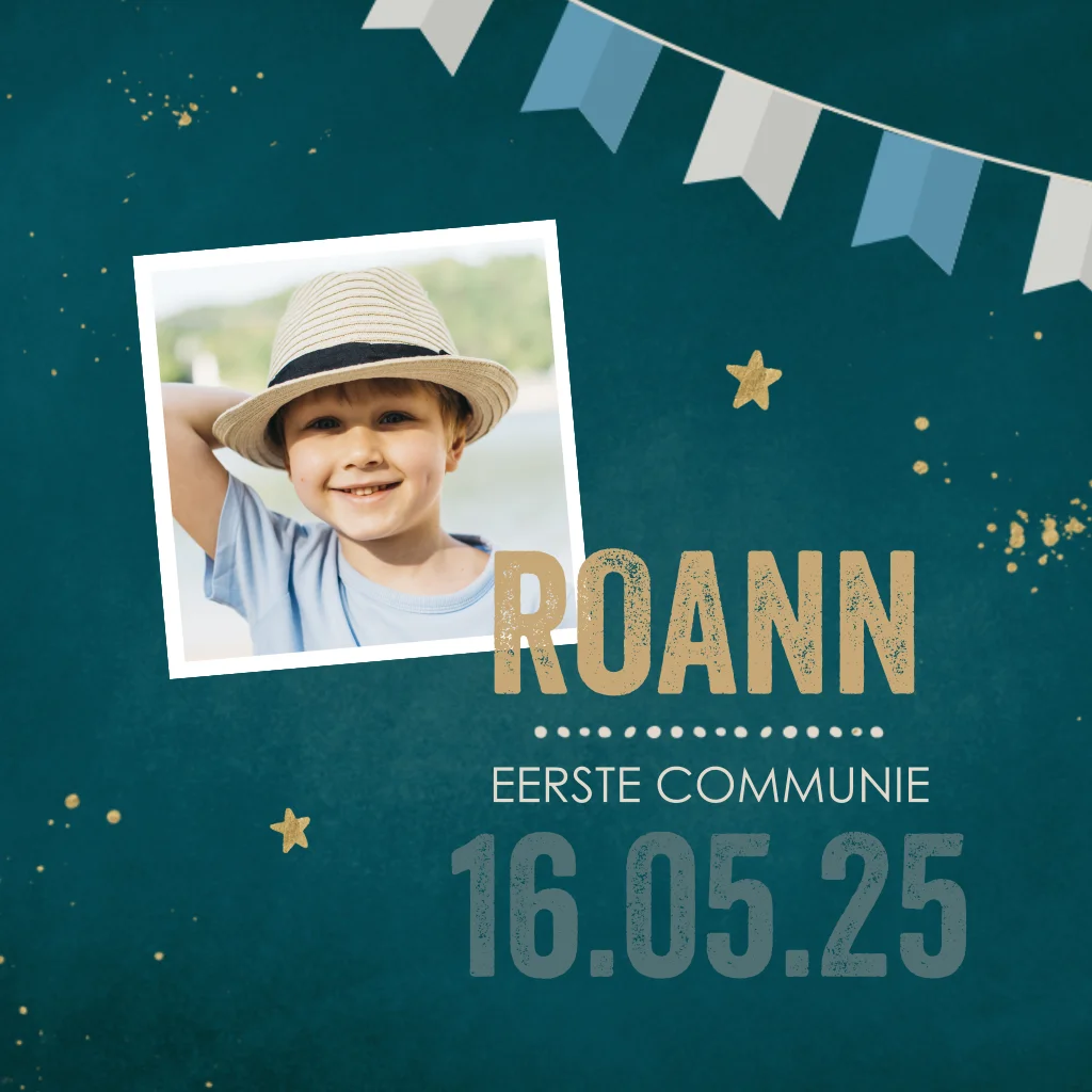 Vrolijke uitnodiging communie voor een jongen met een feestelijke vlaggetjesslinger in blauw en grijs op een donkere petrol achtergrond. De tekst staat in goud en blauw en sterretjes er omheen. Op de voorkant is plaats voor een eigen foto, upload een leuke foto van jullie zoontje en maak de kaart persoonlijk in de online editor.