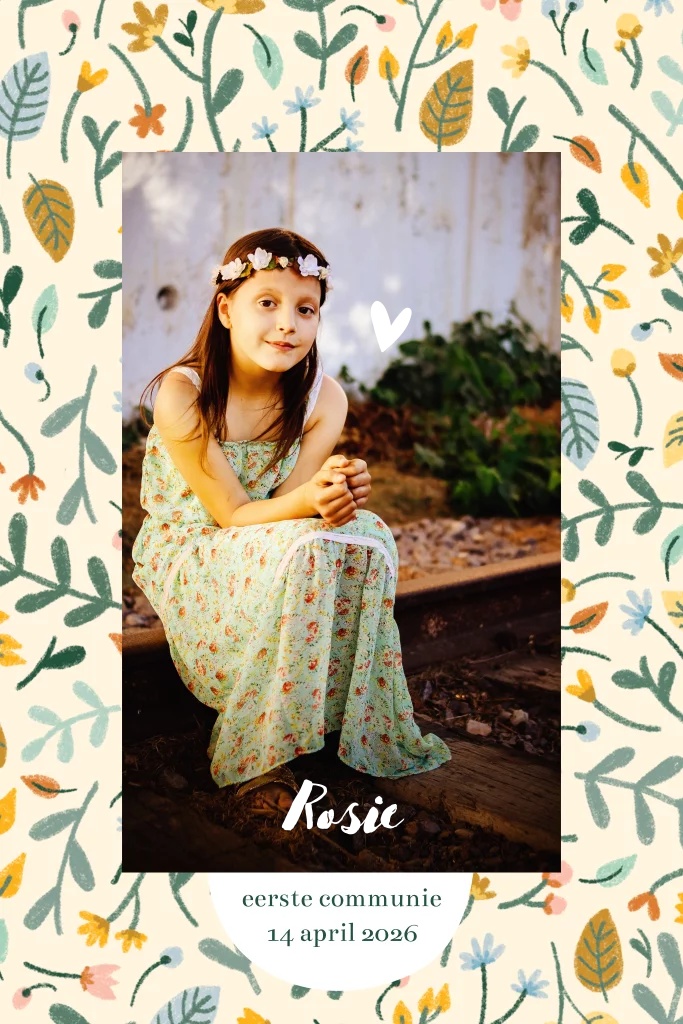 Fleurige uitnodiging communie met kleurrijke takjes en bloemen