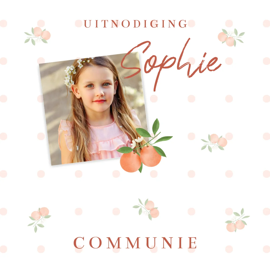 Vrolijk communiekaartje voor een meisje, op de witte achtergrond zie je een patroon van sinaasappels en stipjes, op de achterkant een grotere sinaasappel. Upload een leuke eigen foto in de online editor en maak zo een persoonlijke uitnodiging!