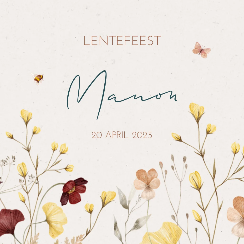 Lief communiekaartje voor een meisje met mooie veldbloemen onderaan de kaart in geel, rood en roze op een pastelkleurige achtergrond. Vlinders en bijtjes vliegen vrolijk rond, maak de kaart naar wens af in de online editor.