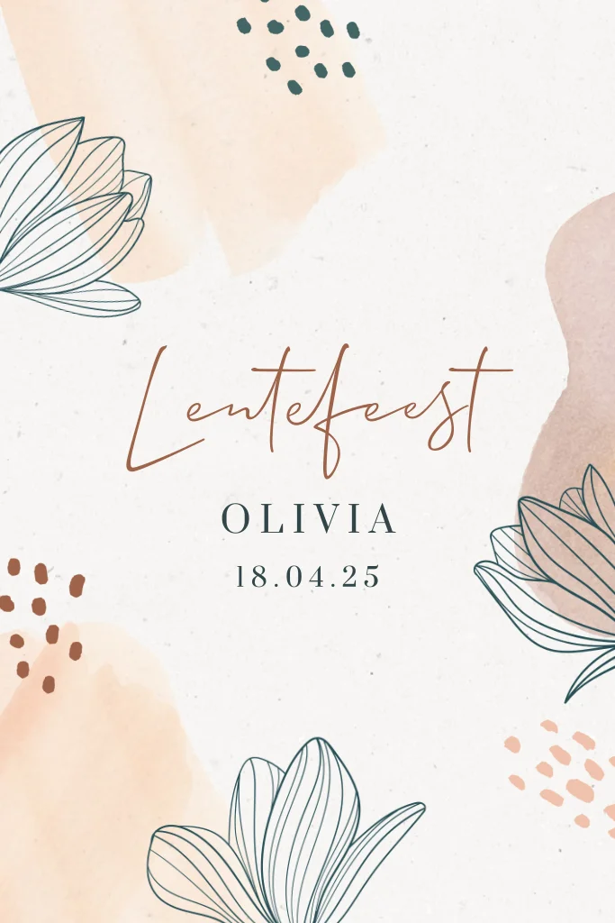 Lief kaartje om vrienden en familie uit te nodigen voor het lentefeest van een meisje. Op de pastelkleurige kaart staan organische vormen in oudroze en peach met getekende bloemen er overheen.