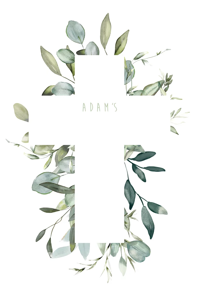 Stijlvol, deze luxe vormselkaart met chique goudfoliedruk! Om de kruisvorm staan zachtgroene takjes van eucalyptus, pas de tekst naar wens aan in de online editor en maak er een persoonlijke uitnodiging van.
