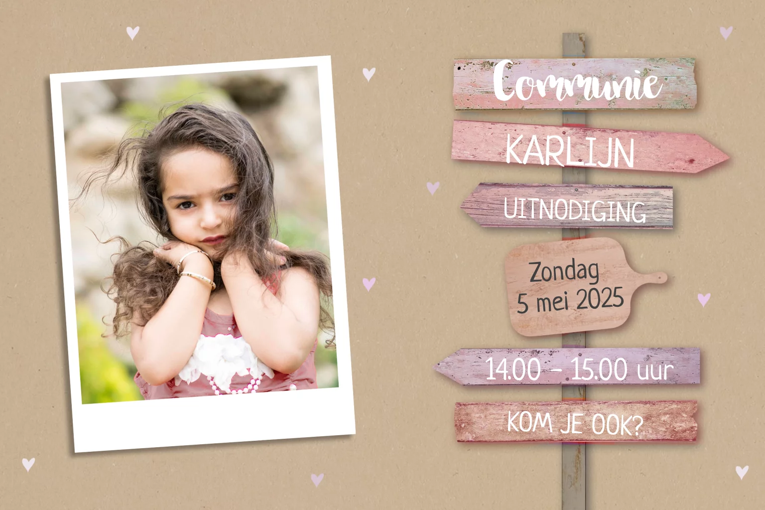 Dit is echt een trendy communiekaart voor een meisje! Op het hippe kraftlook met hartjespatroon staat een leuke strandpaal met roze en paarse planken. Plaats je eigen foto in de polaroid zodat iedereen direct weet van wie de uitnodiging is! In de online editor pas je de teksten op de paal eenvoudig zelf aan.