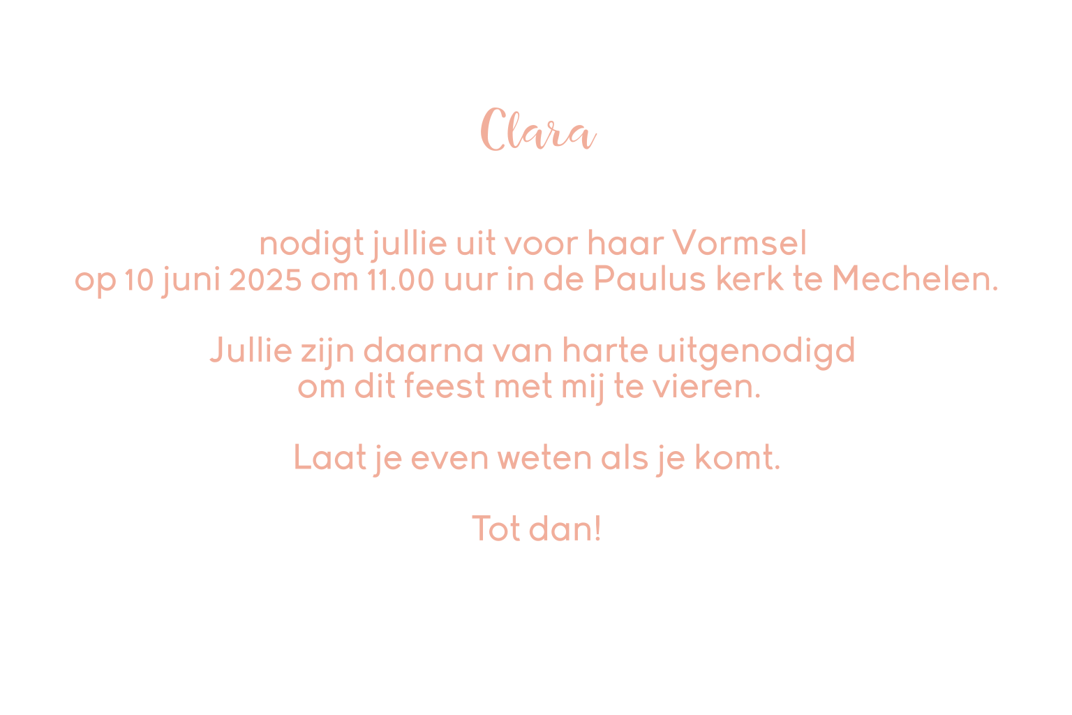 Fotokaart voor een vormsel met ruimte voor een foto over de gehele voorkant. De naam staat in een trendy lettertype over de foto. Kies zelf kleur en lettertype en maak de kaart met persoonlijke tekst helemaal naar eigen wens in de online editor. Zo gedaan!