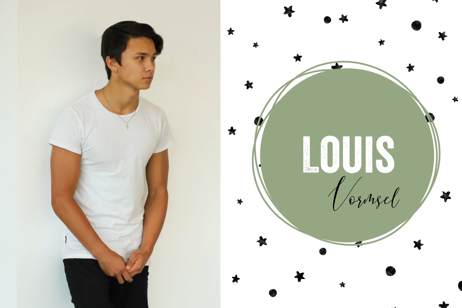 Hippe vormselkaart met aan de linkerkant ruimte om een eigen foto te uploaden. Op het rechtervlak staat een cirkel in mintgroen op een wit vlak met zwarte sterretjes en stipjes. De tekst op de achterzijde staat op mintgroen met wit kader, maak de kaart persoonlijk in de online editor.
