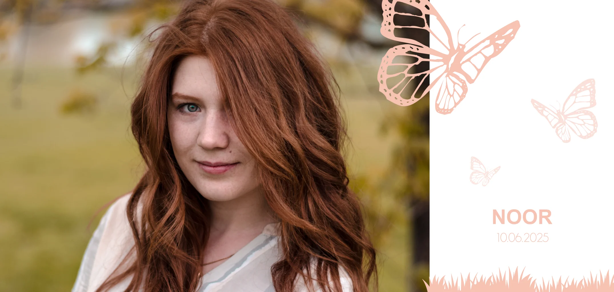 Een lieve vormselkaart voor een meisje. Op deze enkele panoramakaart is ruimte voor een mooie foto, daarnaast verschillende roze vlinders in een landschap. Dit design komt ook terug op de achterzijde, waar je ook de persoonlijke tekst voor de uitnodiging kunt maken in de online editor.