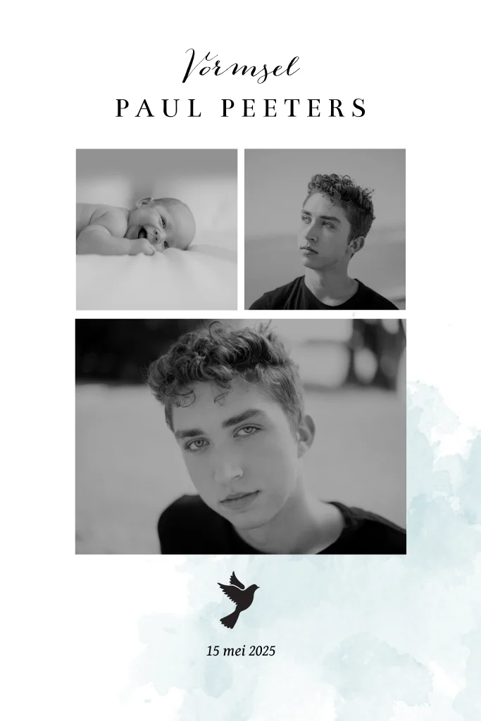 Laat vrienden en familie weten dat het vormsel van jullie zoon binnenkort zal plaatsvinden door middel van deze uitnodiging. Op de witte kaart met een vlak van blauwe waterverf is ruimte voor drie foto's, onder de foto's het silhouet van een duif. Met een modern lettertype zorg je voor een trendy kaart, in de online editor kies je zelf lettertype en kleuren en pas je de teksten naar wens aan.
