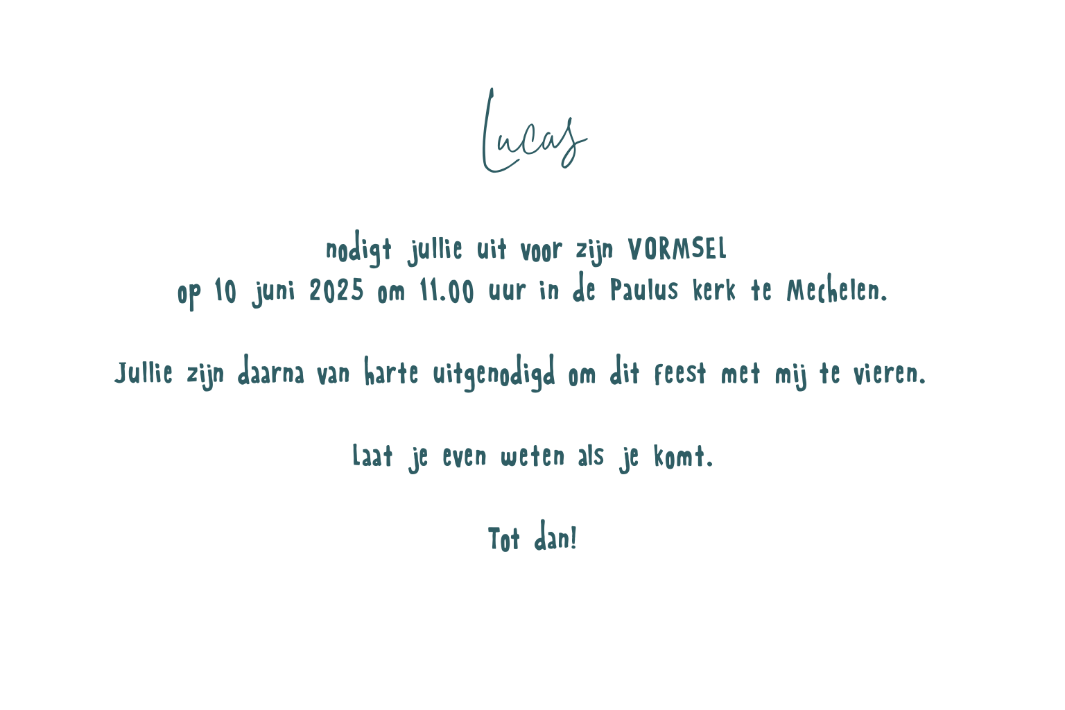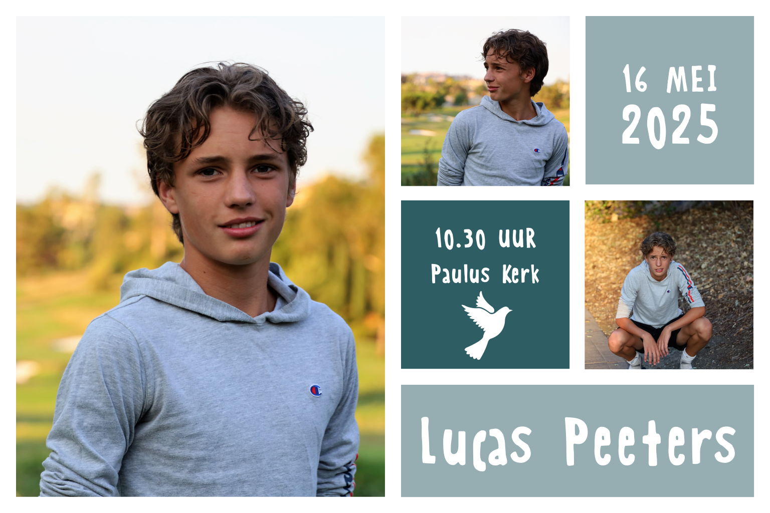 Hippe vormsel uitnodigingskaart waarbij je 3 eigen foto's toe kunt voegen in de witte kaders. Tussen de foto's kleurvlakken in mintgroen en donkergroen, waar de tekst en het silhouet van een duif mooi naar voren komen.