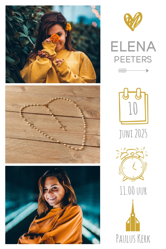 Hippe uitnodigingskaart voor een vormsel met eigen foto's en okergele illustraties. Voeg je eigen foto's toe in de witte kaders en pas de informatie op het kaartje aan in de online editor. De okergele tekeningetjes zoals het hartje en pijltje geven de kaart een trendy look.
