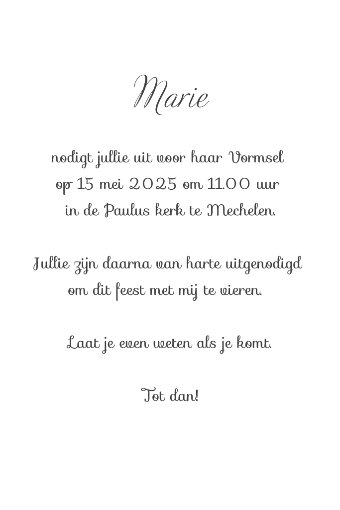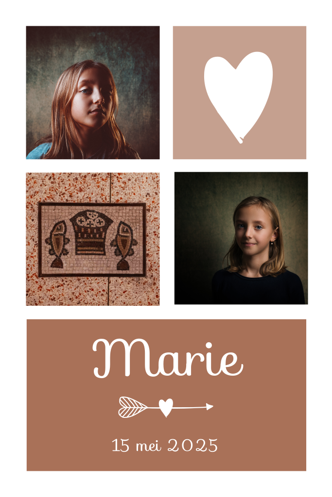 Trendy uitnodigingskaart voor een vormsel met verschillende foto-en tekstvlakken. Op de voorzijde is ruimte voor twee kleinere foto's, aan de binnenzijde kan een grotere foto worden geplaatst. In de kleurvlakken in aardtinten komen tekst en symbolen mooi naar voren. Maak deze mooie kaart eenvoudig persoonlijk in de online editor, hier kun je ook kleuren en lettertypes naar eigen smaak aanpassen.