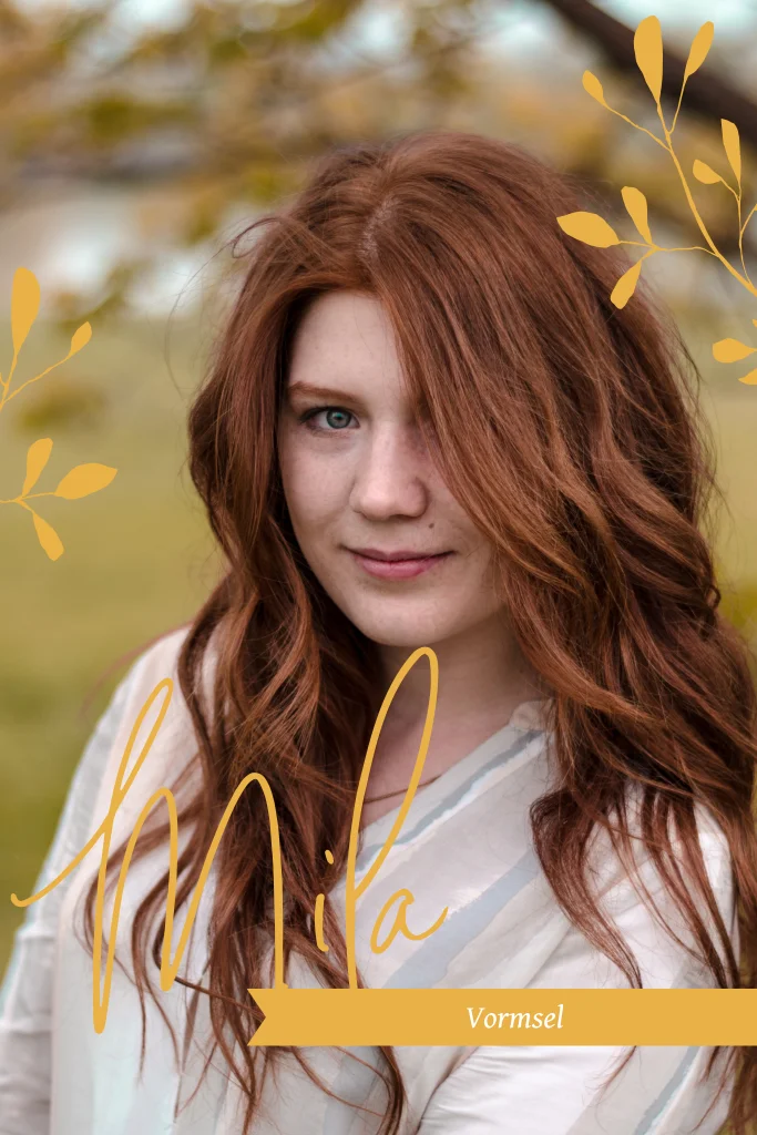 Een hippe uitnodiging voor een vormsel met ruimte voor je mooiste foto op de voorkant. Naast de foto staan okergele takjes. Pas zelf de kleuren en het lettertype aan in de editor.