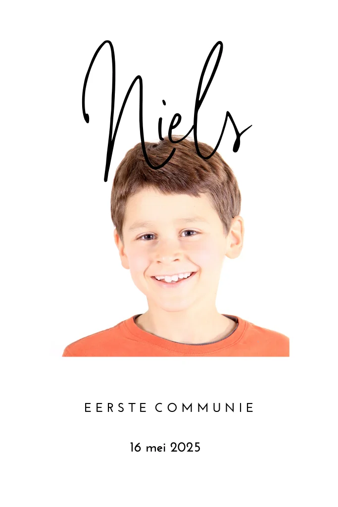 Uitnodigingskaart communie in wit met ronde hoeken staand model. Zet de leukste foto van jullie zoon in het midden, met een modern lettertype maak je deze kaart helemaal trendy. De kaart is eenvoudig aan te passen in de online editor.