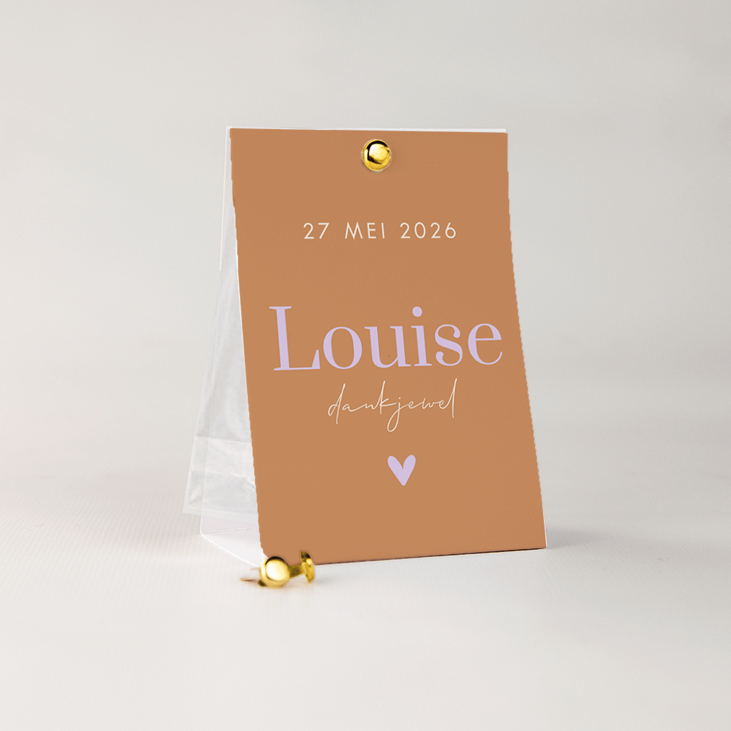 • Voorzien van een gaatje voor de splitpen. Hiermee sluit je het kaartje. De splitpen en het transparant zakje moeten apart besteld worden.