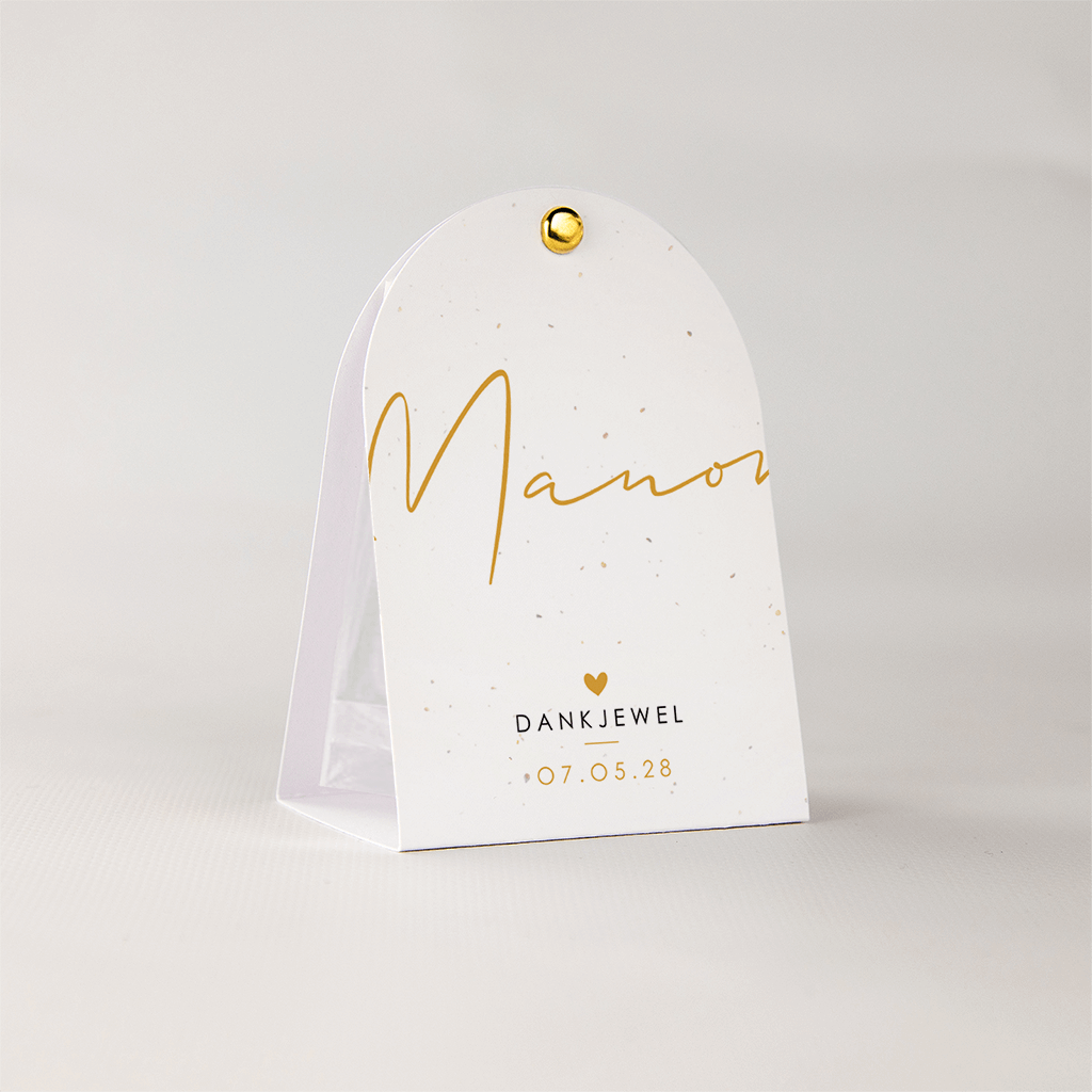 • Voorzien van een gaatje voor de splitpen. Hiermee sluit je het kaartje. De splitpen en het transparant zakje moeten apart besteld worden.