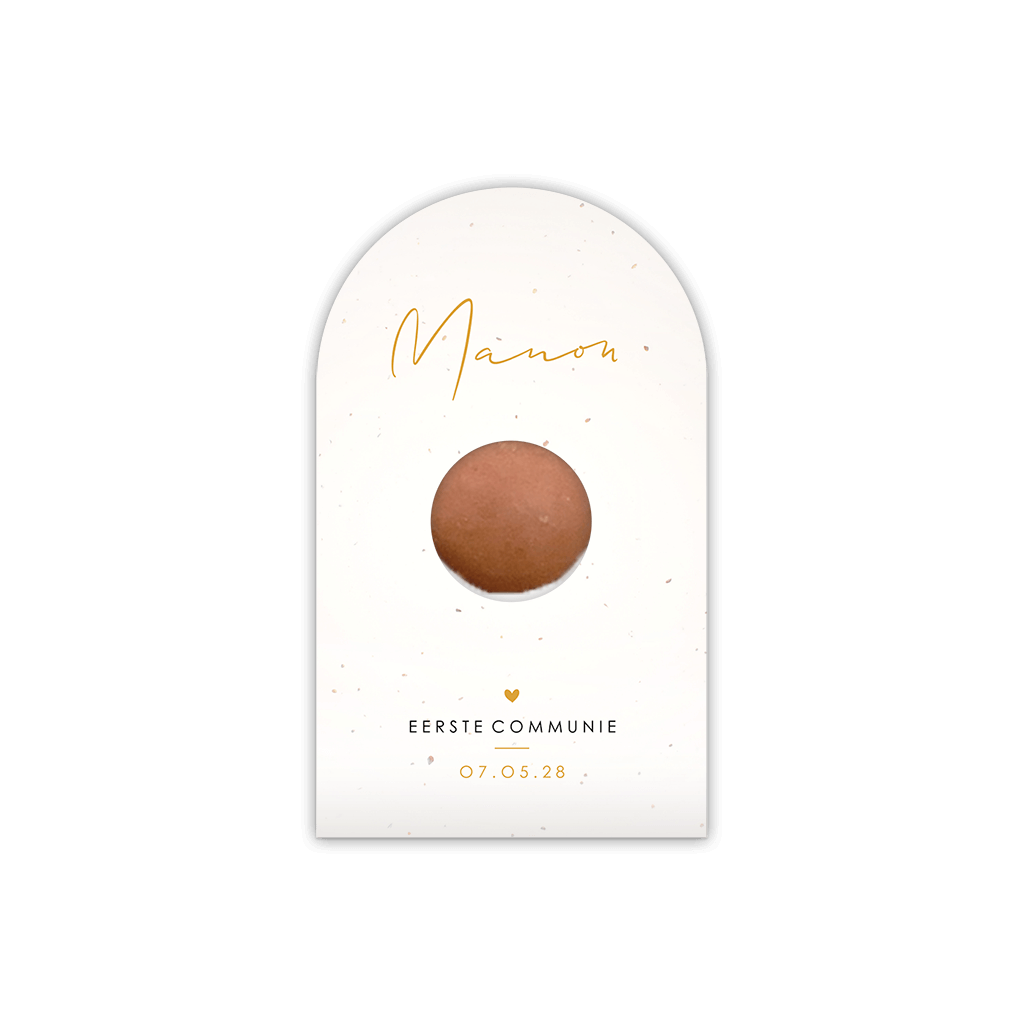 Boogkaartje met sierlijke letters en klein hartje als detail.