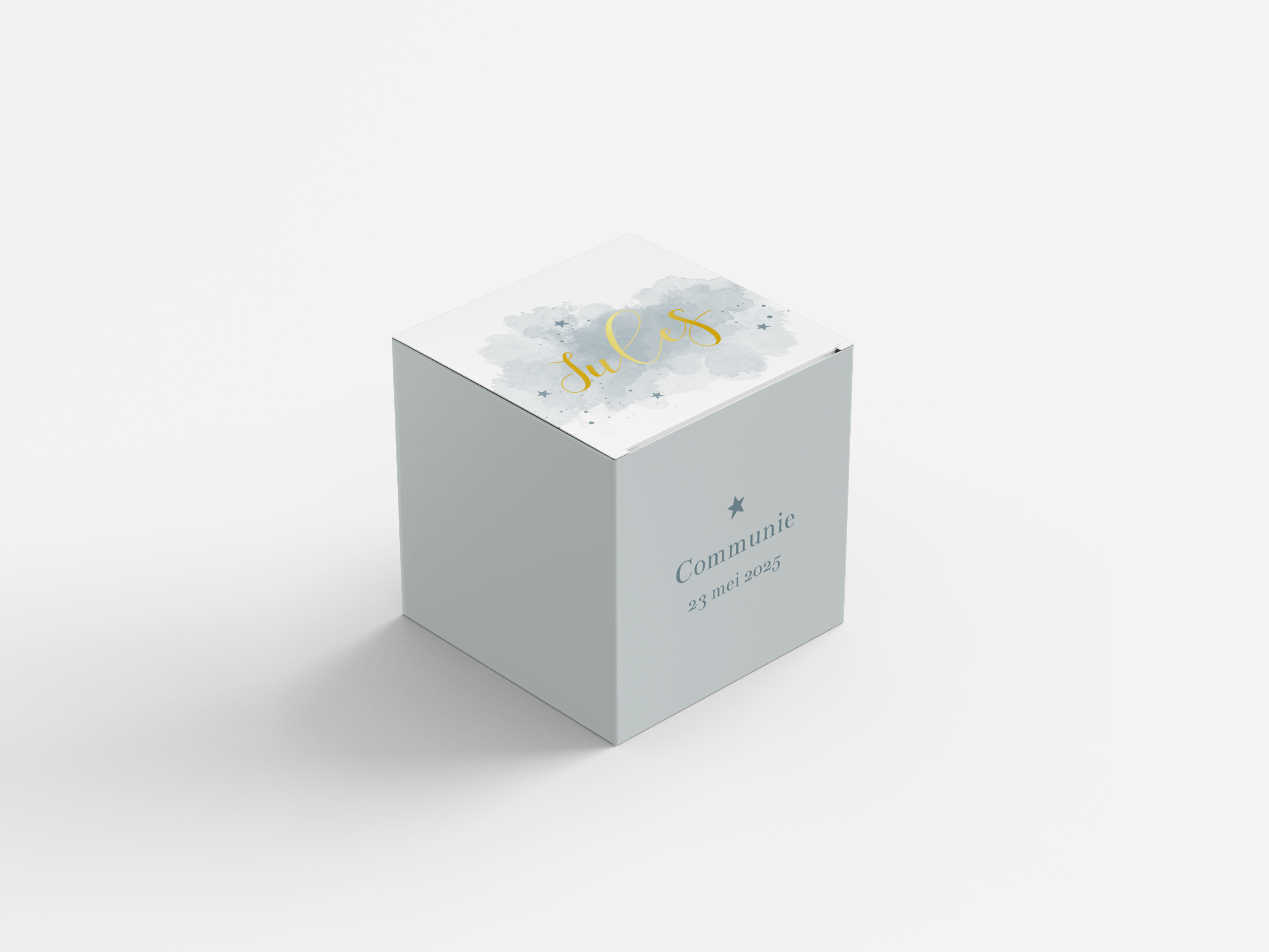 Leuk kubusdoosje in wit met donkerblauwe waterverf en een foto op een zijde. De tekst is in goudfoliedruk, extra feestelijk. Het doosje is 5 cm hoog, breed en diep en wordt ongevouwen geleverd. Levertijd van het doosje is 4 werkdagen.