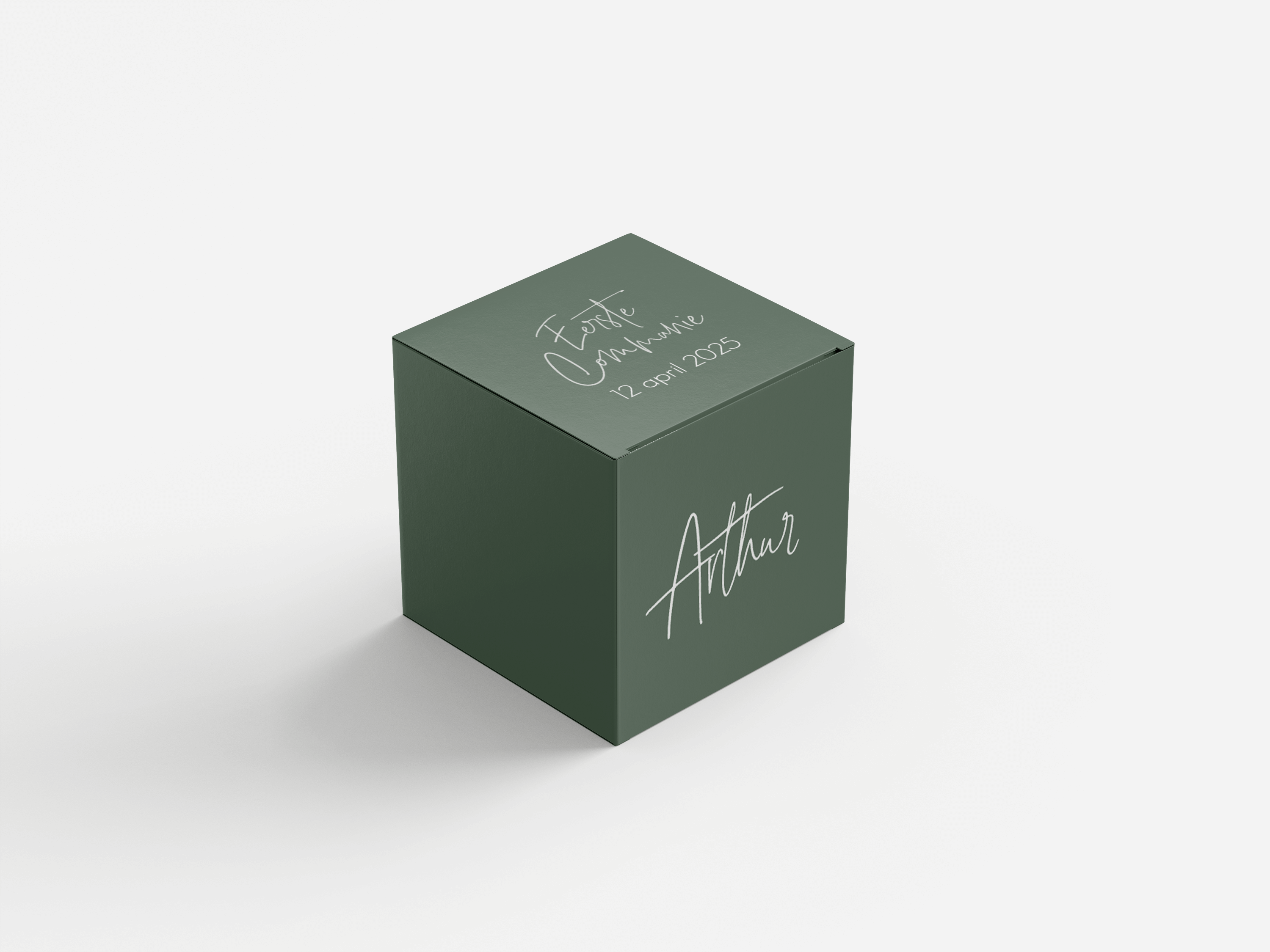 Olijfgroen kubusdoosje met witte tekst en ruimte op 1 zijde om een foto toe te voegen. Het doosje is 5 cm hoog, breed en diep en wordt ongevouwen geleverd. Levertijd van het doosje is 4 werkdagen.