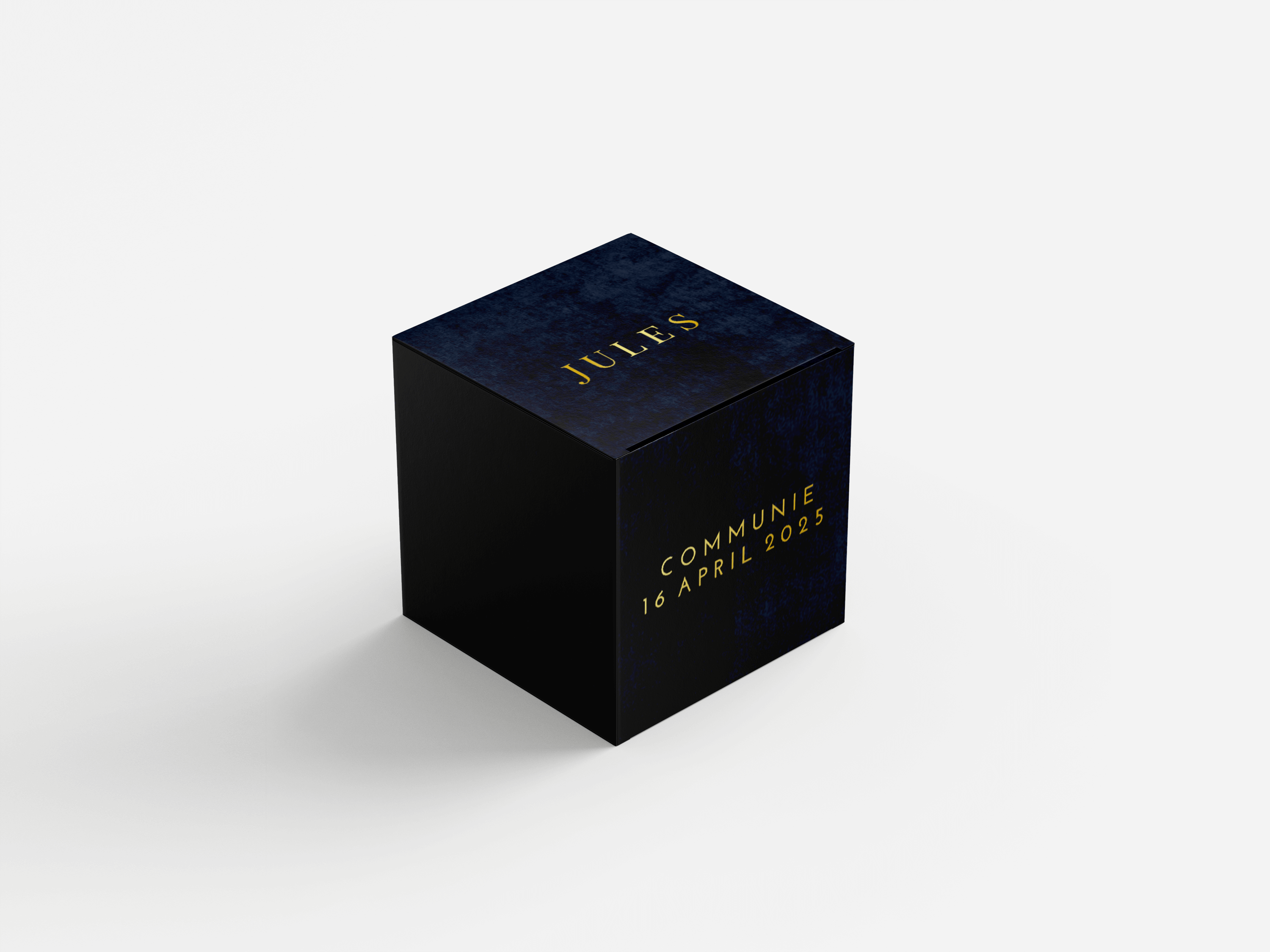 Leuk kubusdoosje in donkerblauw met goudfoliedruk, op 1 zijde is ruimte voor een eigen foto. Het doosje is 5 cm hoog, breed en diep en wordt ongevouwen geleverd. Levertijd van het doosje is 4 werkdagen.