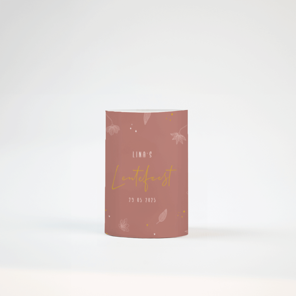 Sfeervol windlichtje met roze achtergrond en zwevende bloempjes. Om de bloempjes heen staan kleine sterretjes en stipjes.