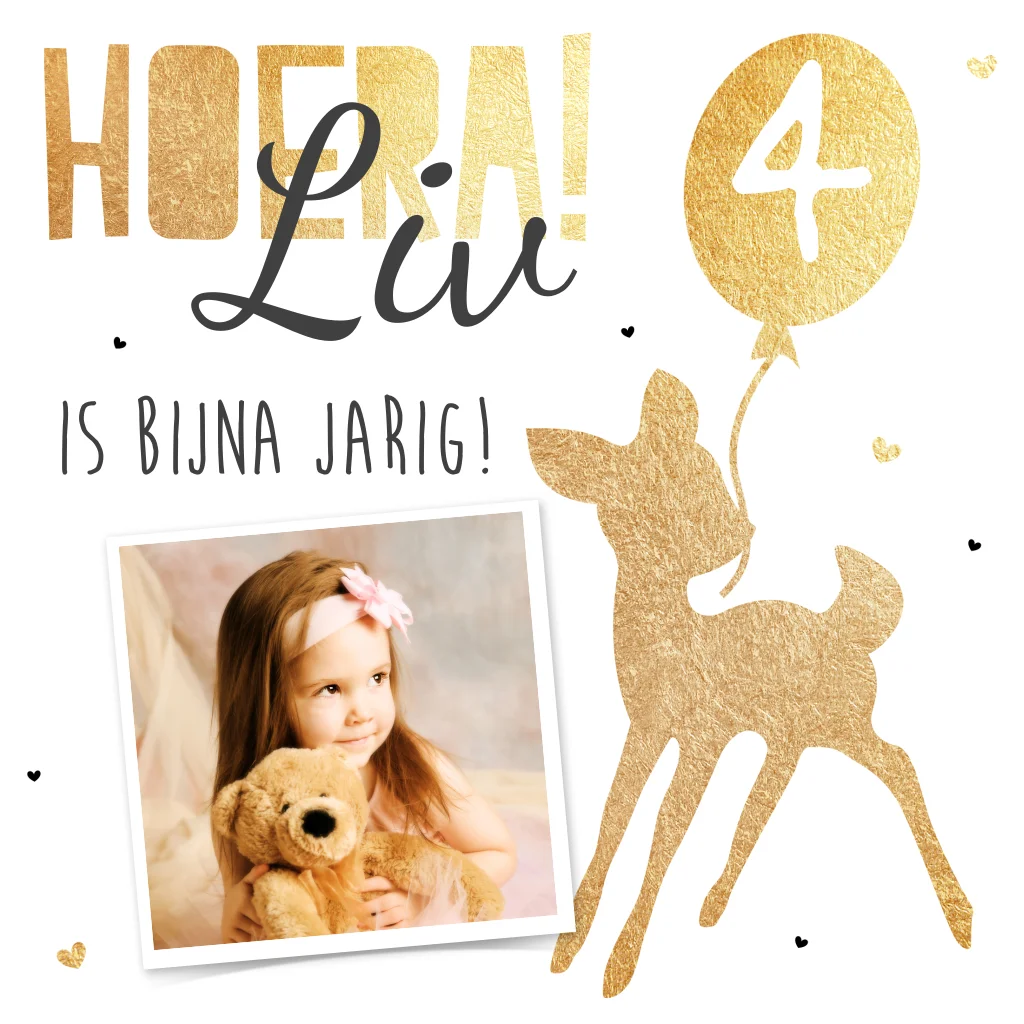 Alweer 4 jaar, hoera! Nodig vriendjes en vriendinnetjes van jullie dochter uit met dit trendy kaartje met een hertje en ballon en 'hoera' in goudkleur, echt feestelijk! Met een leuke eigen foto en tekst maak je er in de online editor een uniek kaartje van!