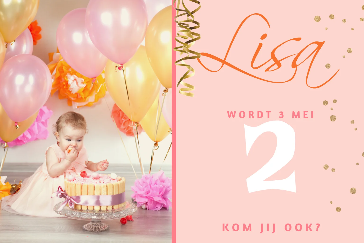 Lief en trendy verjaardagskaartje voor het feestje van een 2-jarig meisje, versierd met vrolijke slingers en confetti in goudlook en een grote 2. De trendy typografie in bijpassende kleur maakt het helemaal af, pas de tekst eenvoudig aan in de online editor. Met een eigen foto maak je hem helemaal af!