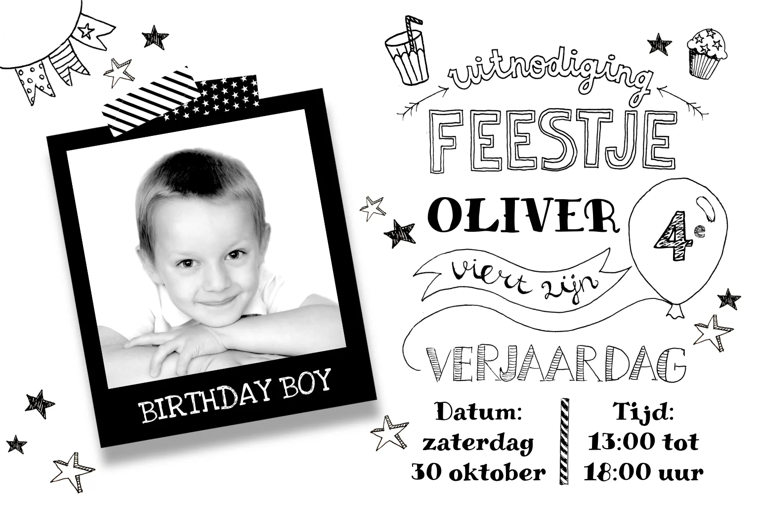 Trendy kaartje in zwart-wit om vriendjes en vriendinnetjes uit te nodigen voor jouw kinderfeestje! Door gebruik van verschillende lettertypes en illustraties in handlettering stijl een vrolijk kaartje. Pas zelf teksten en foto aan in de online editor voor een unieke uitnodiging!