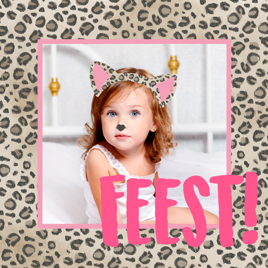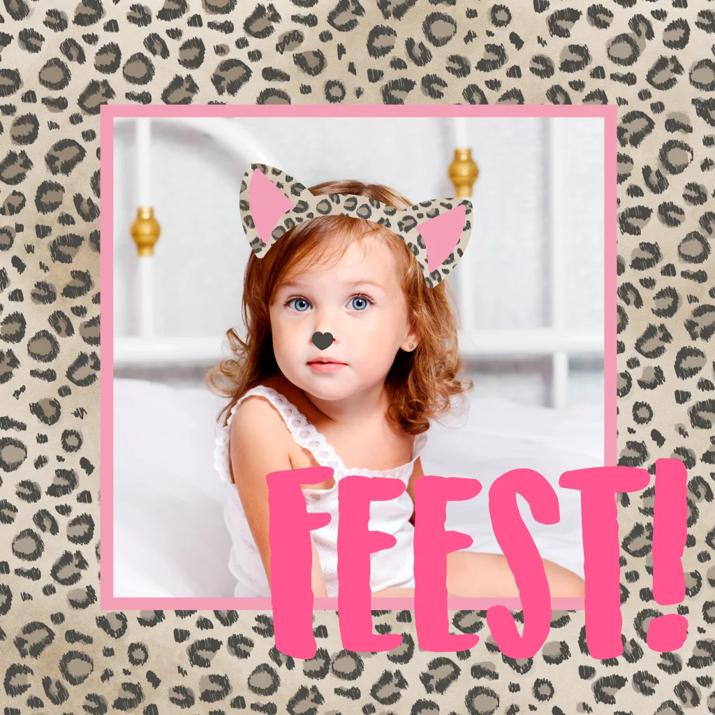 Een vierkante uitnodigingskaart met een panterprintachtergrond en een eigen foto: wat hip en stoer! Leuk voor het kinderpartijtje van een kleine meid. Wanneer is jullie feest? Upload een leuke foto, pas de tekst aan en je hebt een superstoere uitnodiging!