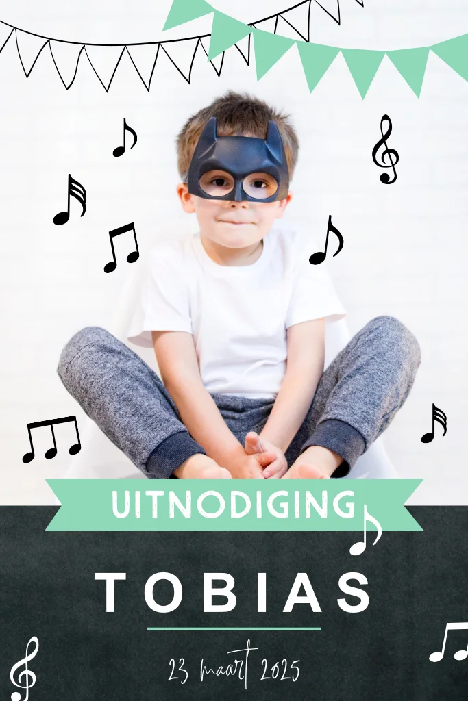 Kinderuitnodiging met foto, slingers en muzieknoten