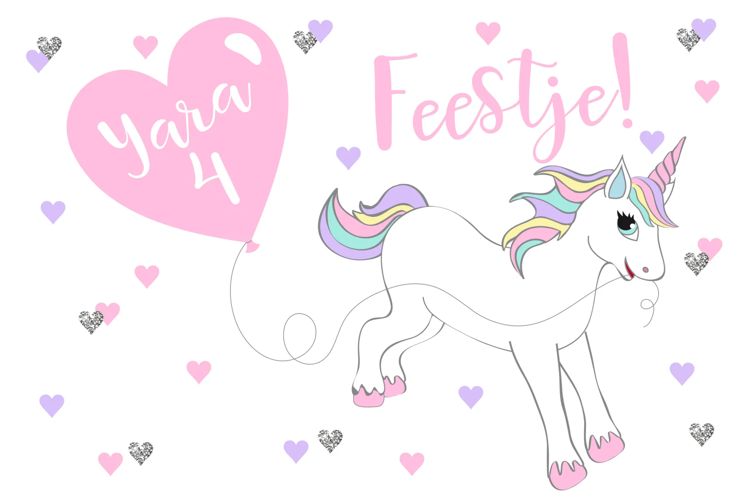 Hippe uitnodiging voor het kinderfeestje van jullie dochter. Hij is versierd met hartjes en een eenhoorn met regenboogmanen. De naam van de kleine meid en haar leeftijd kun je in de roze ballon zetten! Pas het kaartje gemakkelijk zelf aan in de online editor.
